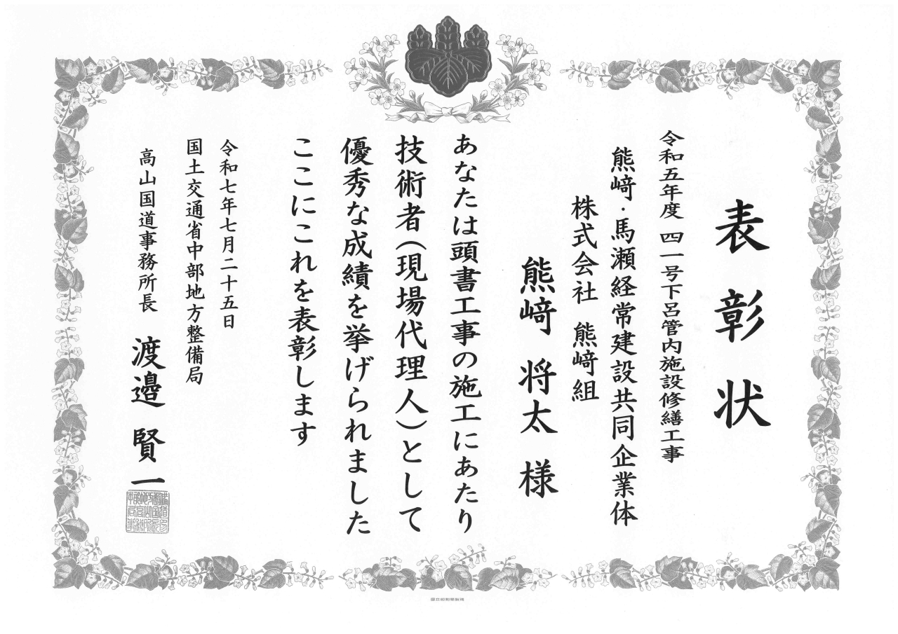 令和5年度 41号下呂管内施設修繕工事の表彰状をいただきました